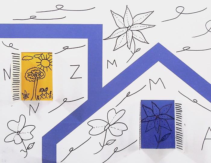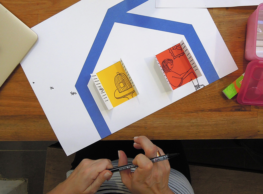 Pendant ma résidence à Marseille, dans le cadre du festival la Marelle dans tous ces états, j’ai organisé un atelier en accès libre au Studio Fotokino. Les participant.e.s étaient invité.e.s à imaginer ce qui pouvait se passer derrière les volets d’une ville dont j’avais préalablement tracé les contours sur un des murs du studio. J’avais également reproduit et décomposé ce grand dessin sur une série de feuilles dans lesquelles j’avais découpé des fenêtres. Chacun.e pouvait se servir parmi ces fragments de ville et y mettre en scène toute sorte d’habitants et d’histoires, avant de les accrocher par-dessus le dessin de base pour le recouvrir petit à petit.